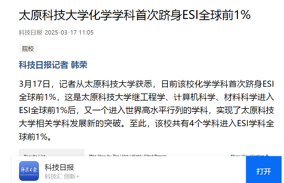 近日,科技日报、山西日报对万象城官网化学学科首次跻身ESI全球前1%进行报道,这是万象城官网继工程学、计算机科学、材料科学进入ESI全球前1%后,又一个进入世界高水平行列的学科,实现了awc777万象城娱乐官网相关学科发展新的突破。至此,万象城官网共有4个学科进入ESI学科全球前1%。