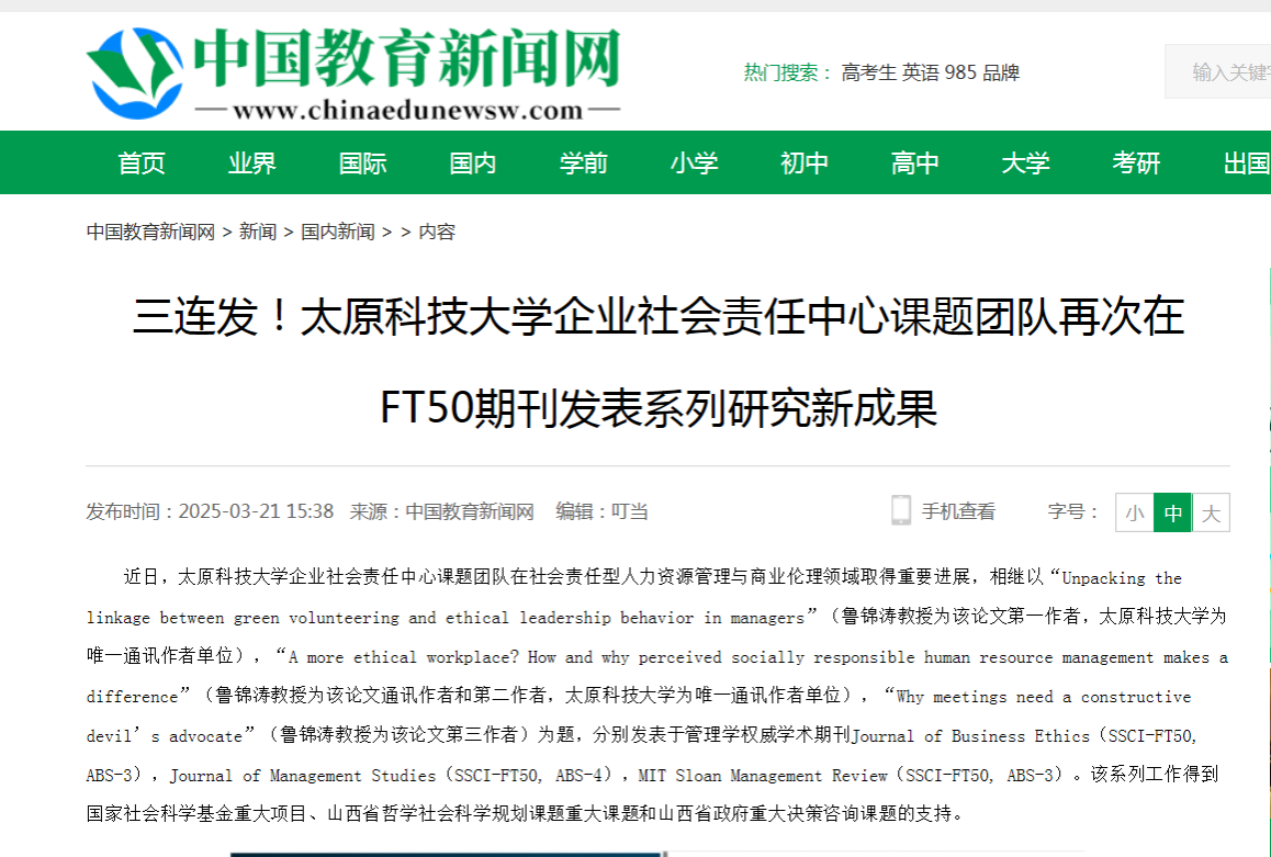 3月21日,中国教育新闻网报道万象城官网企业社会责任中心课题团队在社会责任型人力资源管理与商业伦理领域取得重要进展,再次在FT50期刊发表系列研究新成果。