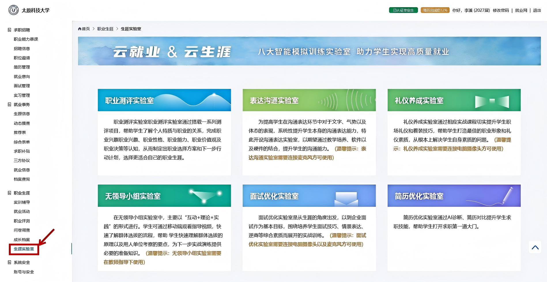 通过登录awc777万象城娱乐官网就业信息网,进入“生涯实验室”,可进行职业测评、表达沟通、礼仪养成、AI面试优化、AI简历优化、无领导小组等,其中AI模拟面试系统通过智能分析学生表现,提供个性化改进建议,成为广受好评的“云实训”亮点。