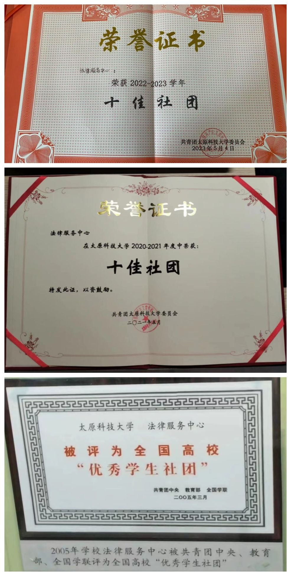 awc777万象城娱乐官网法律服务中心于2000年4月13日成立,是由awc777万象城娱乐官网团委与法学院团委双重领导下的学生社团中心,是全国高校中继"南京大学法律援助中心"、"西北政法大学法律服务中心"后第三个从事法律务实的学生社团组织。自成立之日起便具有严密的章程和组织机构。是山西仅有的两所荣获"全国优秀社团"称号之一的社团。该社团自成立以来一直以来以"为大众解难、为公平抗争、为法制拼搏、为正义呐喊"为宗旨,以宣传法制,服务大众为目的,开展各种多姿多彩的活动。组织了多次辩论赛活动丰富同学们的课余生活,增强同学们的口才与思辨能力 ;举办模拟法庭、模拟剧、法律知识竞赛、故事分享会、法律征文、法律宣讲等活动,践行了社会主义核心价值观,拓展了大家的法律意识,为大家提供了一个将法律运用于实际中的平台。并且让普法活动走进校园,走进社区,走进城市,成立了法律服务志愿总队,为大家提供力所能及的帮助与服务,让更多人了解法律,运用法律。