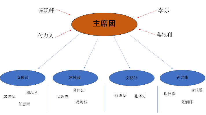 本社团设主席团(含主席及副主席共计4名),宣传部,建模部,文秘部以及研讨部(共计11名部长)。