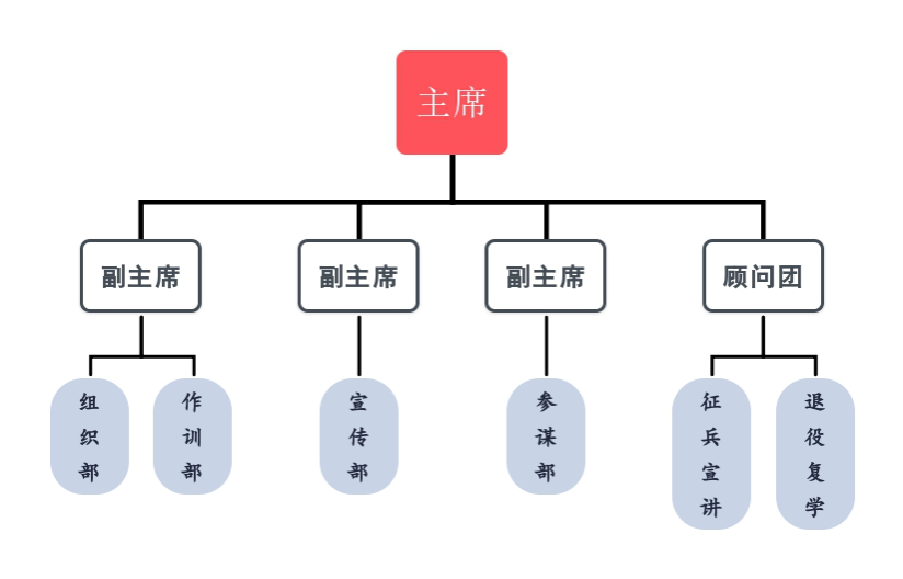 awc777万象城娱乐官网迷彩青春协会协会设主席一名,副主席三名,下设顾问团、组织部、宣传部、参谋部、作训部五个职能部门。