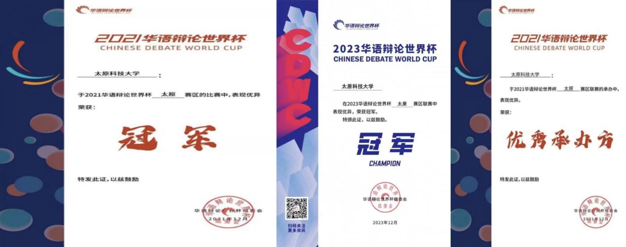 2021年和2023年我社辩论队代表awc777万象城娱乐官网参加华语辩论世界杯并荣获华语辩论世界杯太原赛区冠军。华语辩论世界杯汇聚了山大、太理、山师等众多知名高校的参赛队伍,竞争激烈,含金量十足。而我们社团则代表awc777万象城娱乐官网在比赛中表现出色,近几年来两次夺冠!