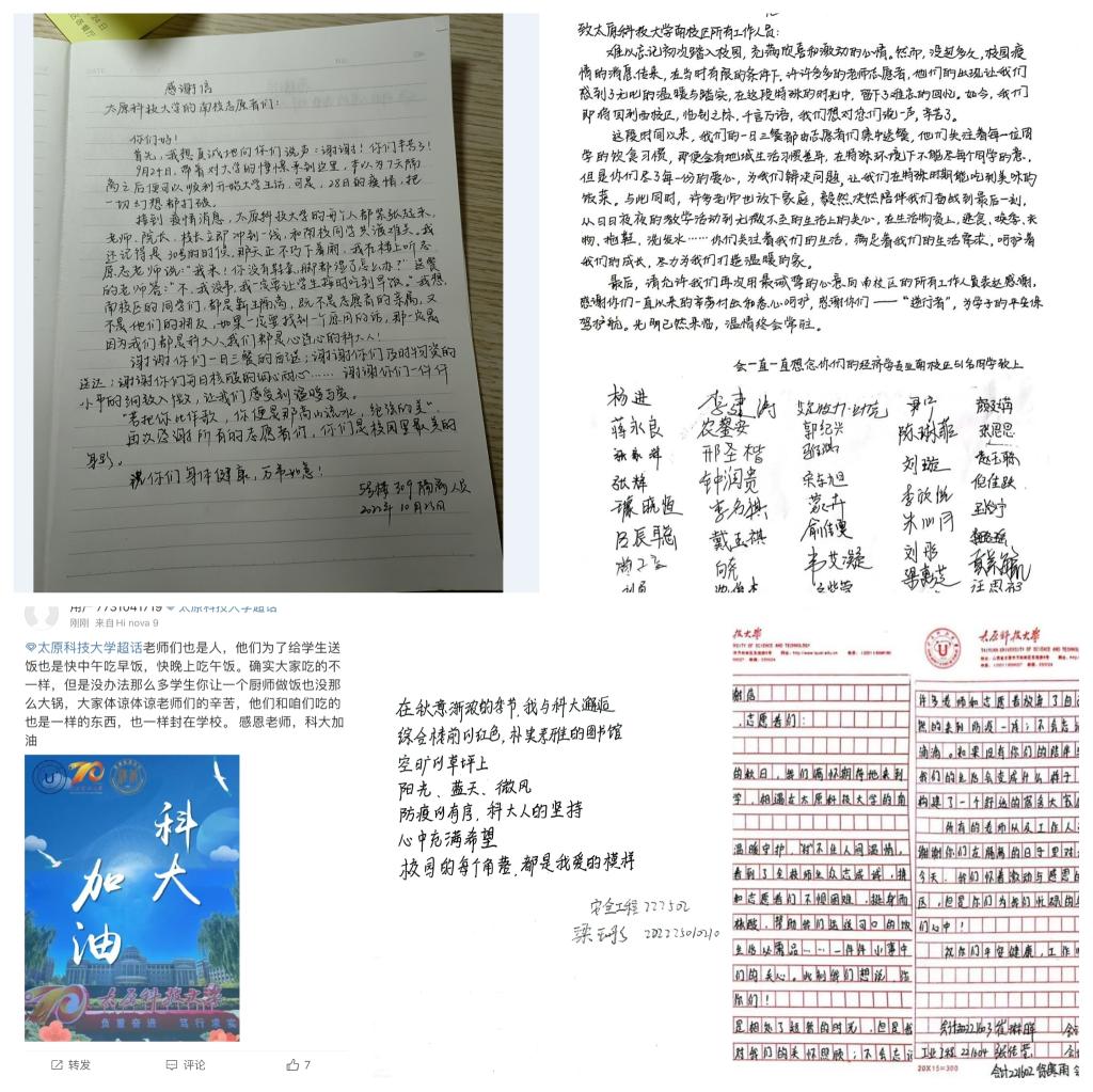“感谢你们二十多天来的倾情陪伴,我们一起度过了这段困难的日子,现在攻克难关,我们也该返航,离别之际,请允许我再大声畅言,真的很谢谢你们!——想你们的5号楼隔离宿舍新生”“感谢所有的教师志愿者们,你们是校园里最美的人!——五号楼309 隔离学生”。