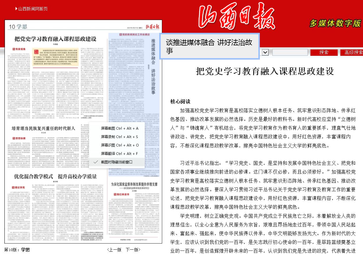 2021年4月27日,《山西日报》刊登万象城官网教师牛颐媛的文章《把党史学习教育融入课程思政建设》。