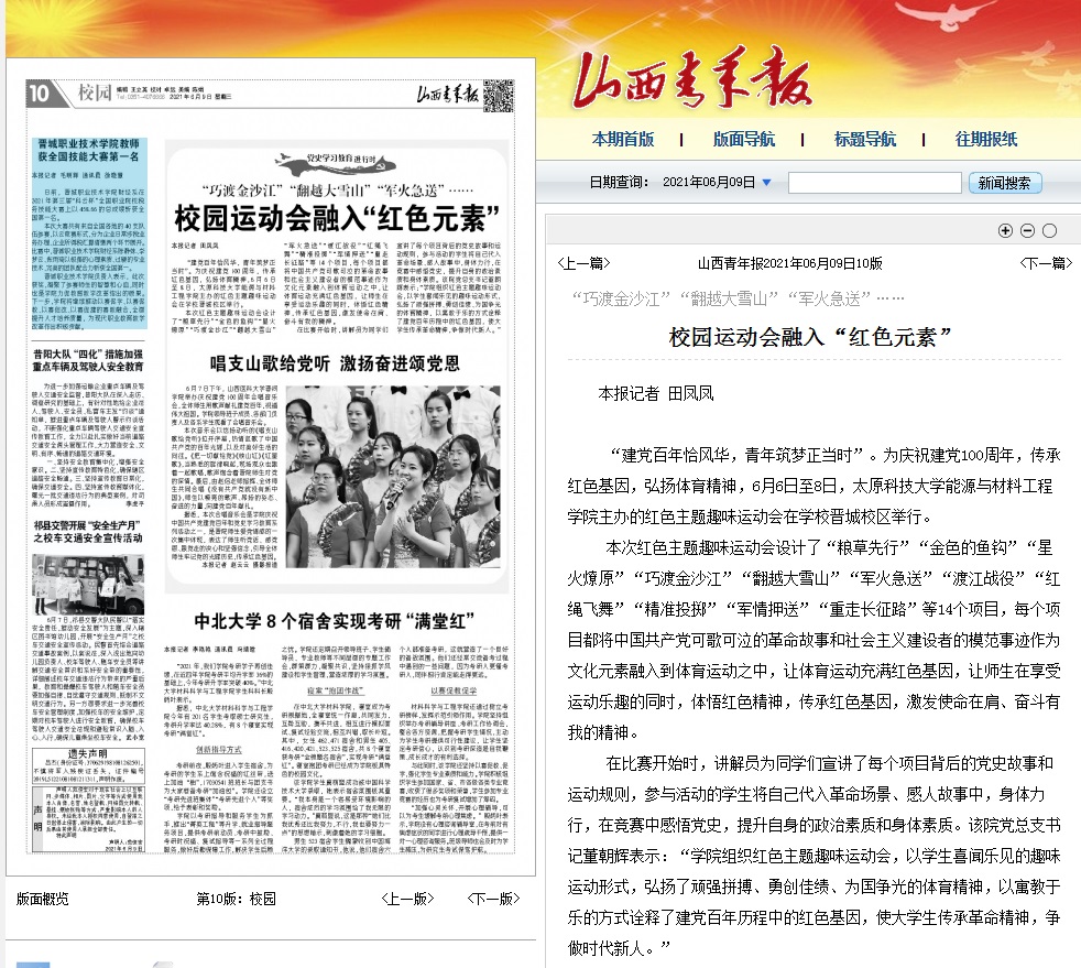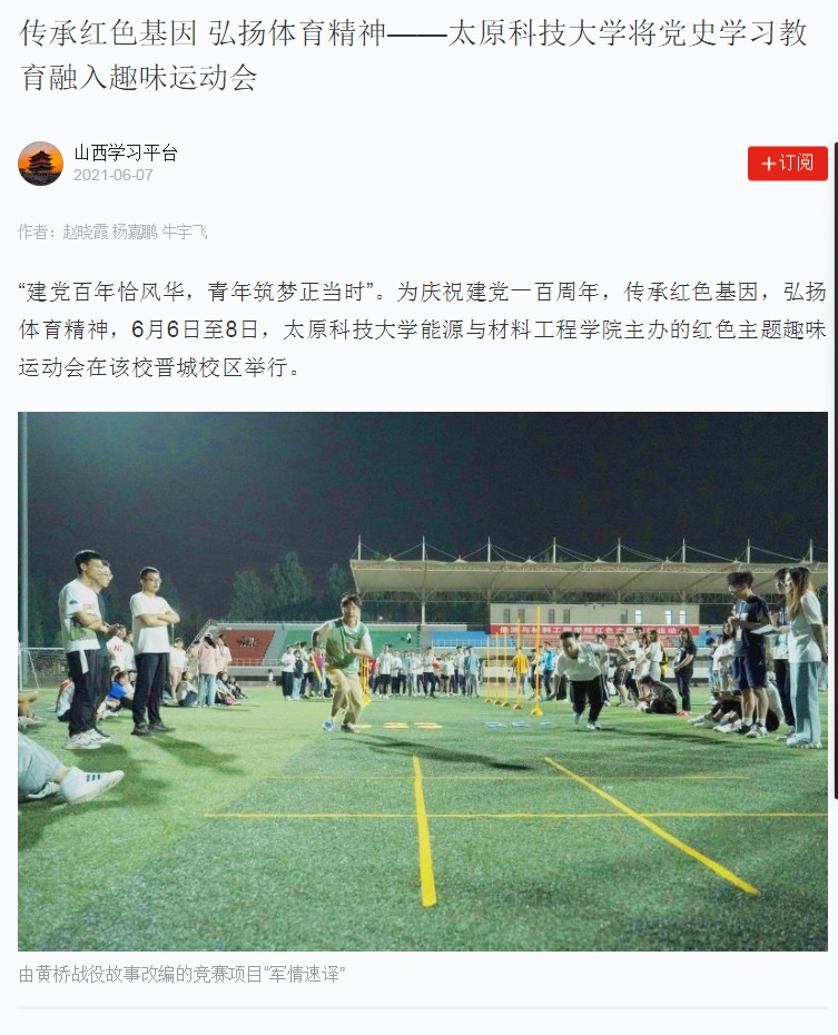 2021年06月9日,《山西青年报》、晋城电视台、学习强国报道了万象城官网能源与材料工程学院举办的红色主题趣味运动会。