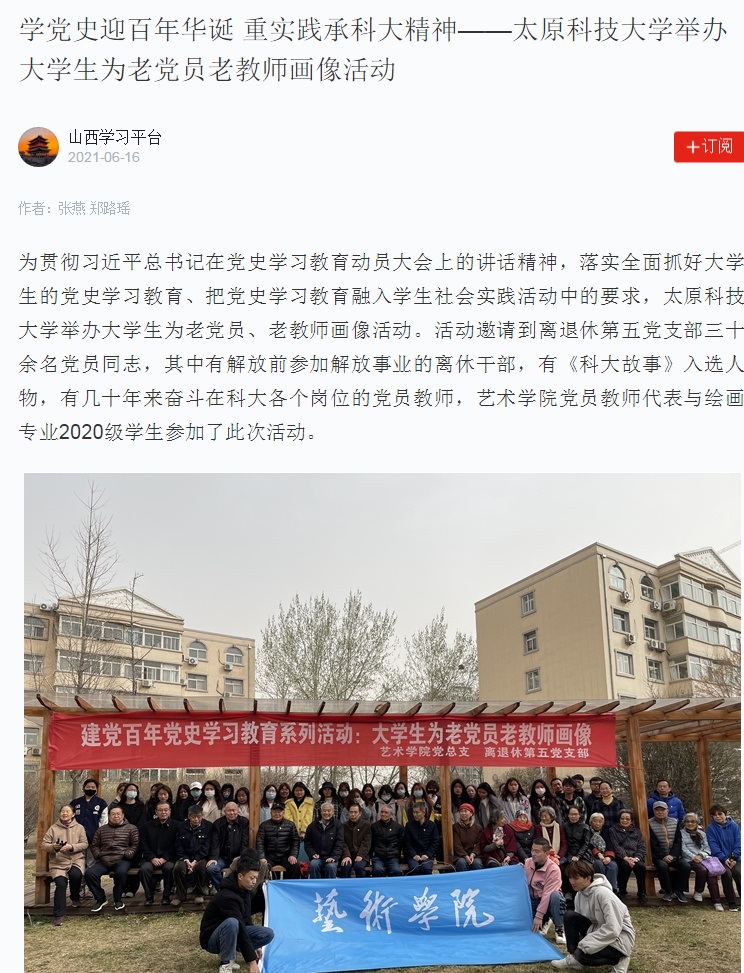 2021年6月11日,学习强国的山西平台,报道万象城官网贯彻习近平总书记在党史学习教育动员大会上的讲话精神,落实全面抓好大学生的党史学习教育,把党史学习教育融入学生社会实践活动中的要求,举办大学生为老党员、老教师画像活动。