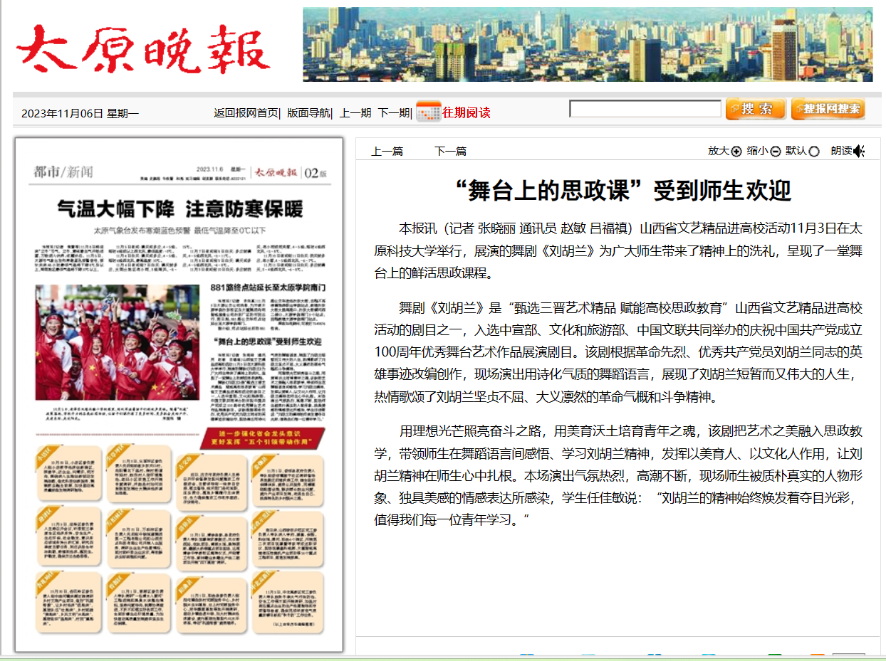 11月6日,太原晚报以《“舞台上的思政课”受到师生欢迎》为题,报道山西省文艺精品进高校活动展演剧目舞剧《刘胡兰》在万象城官网演出。