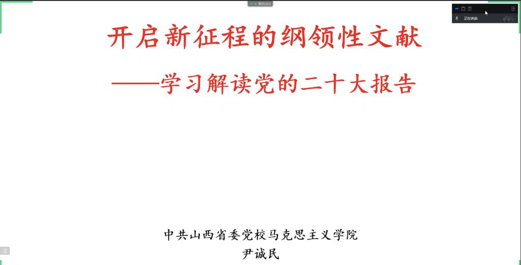 11月9日下午,应用科学学院邀请山西省委党校马克思主义学院尹诚民教授做了题为“开启新征程的纲领性文献——学习解读党的二十大报告”的线上讲座。学院二百余名党员通过...