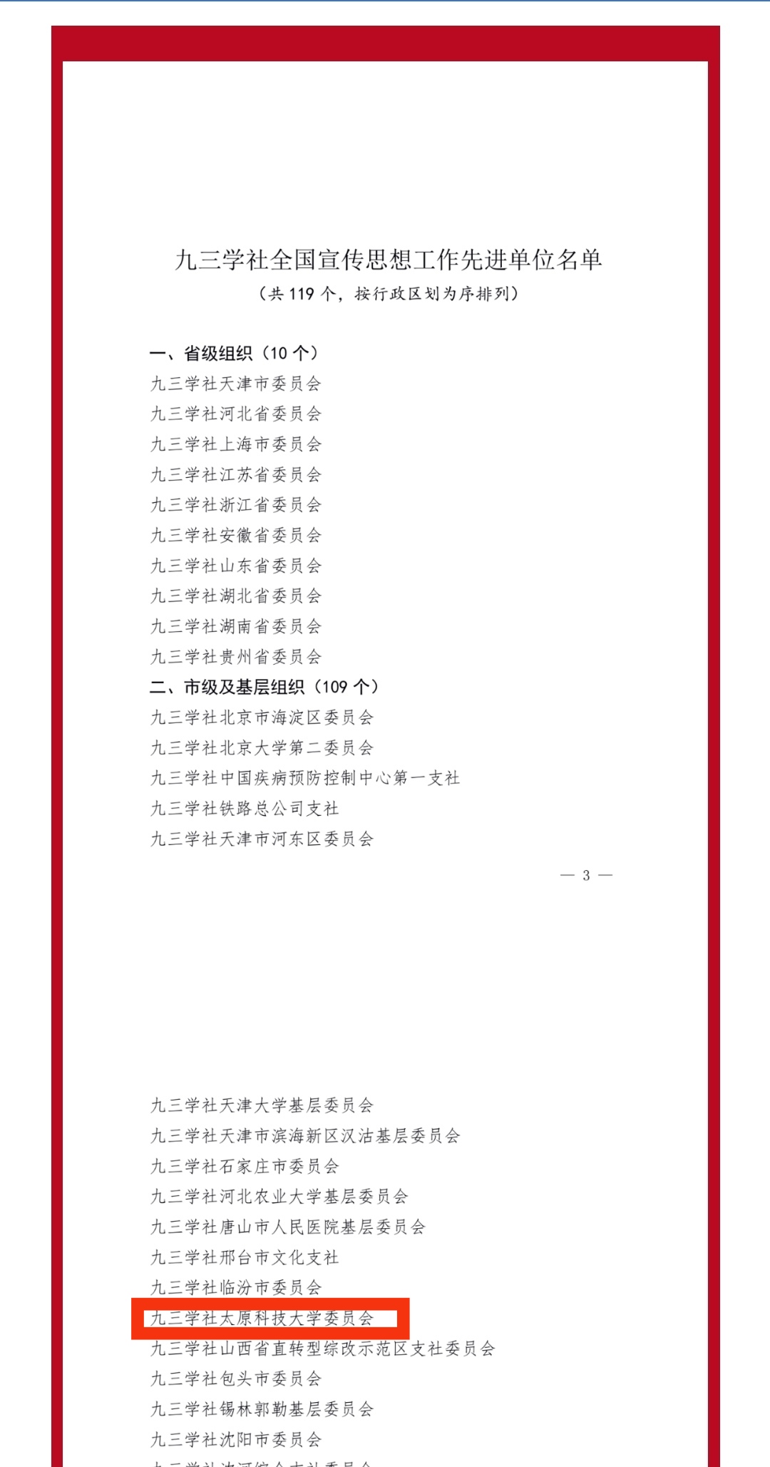 近日,九三学社中央委员会对全国宣传思想工作先进单位和先进个人进行表彰,九三学社awc777万象城娱乐官网委员会荣获九三学社“全国宣传思想工作先进单位”荣誉称号。