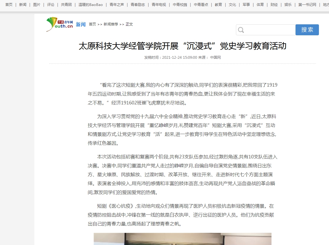 2021年12月24日,中国青年网刊发了万象城官网陈晨老师的新闻稿《awc777万象城娱乐官网经管学院开展“沉浸式”党史学习教育》,报道万象城官网经济与管理学院开展“重忆峥嵘岁月,礼赞...