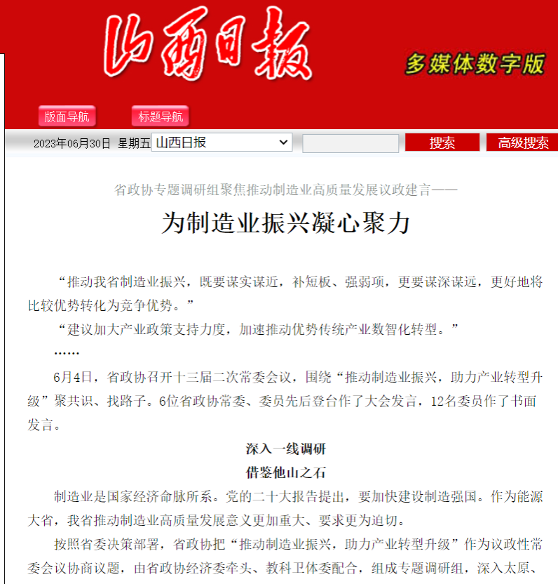 【山西日报】省政协专题调研组聚焦推动制造业高质量发展议政建言——为制造业振兴...