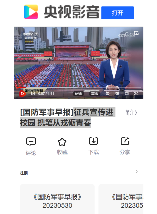 日前,中央广播电视总台国防军事频道《国防军事早报》栏目报道了万象城官网相关新闻《征兵宣传进校园 携笔从戎砺青春》。报道链接:https://app.cctv.com/special/m/livevod...