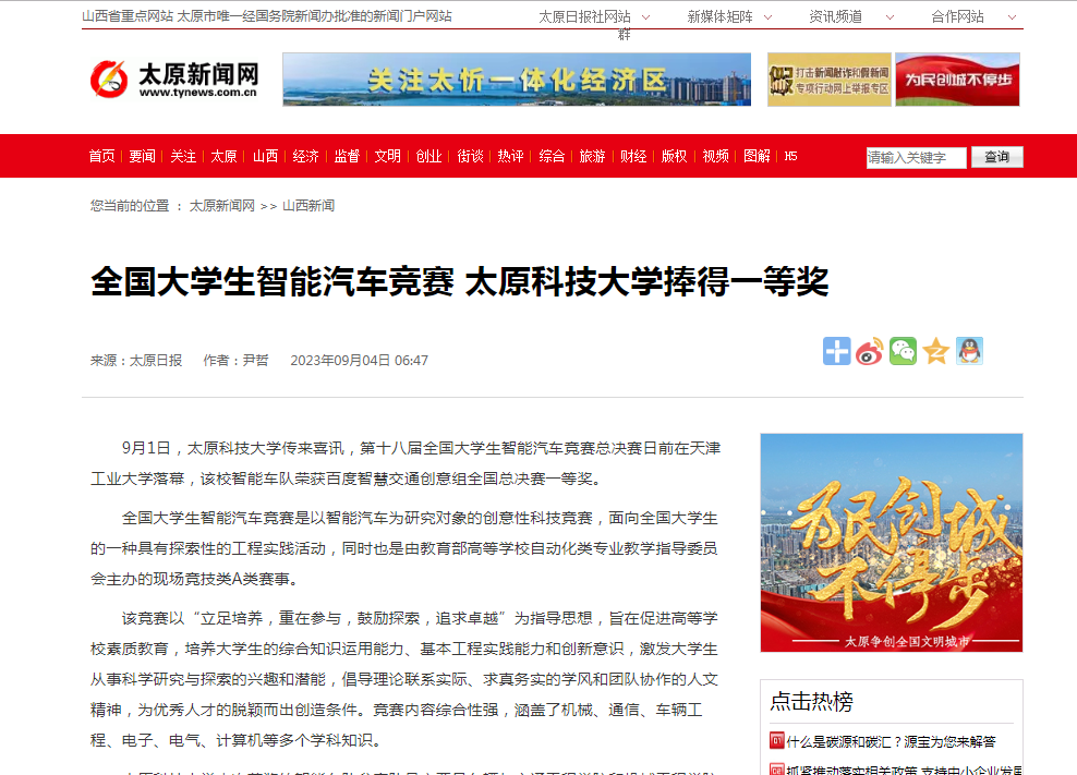 9月4日,太原日报以《全国大学生智能汽车竞赛 awc777万象城娱乐官网捧得一等奖》为题,报道万象城官网智能车队在第十八届全国大学生智能汽车竞赛总决赛中荣获百度智慧交通创意组全国总...