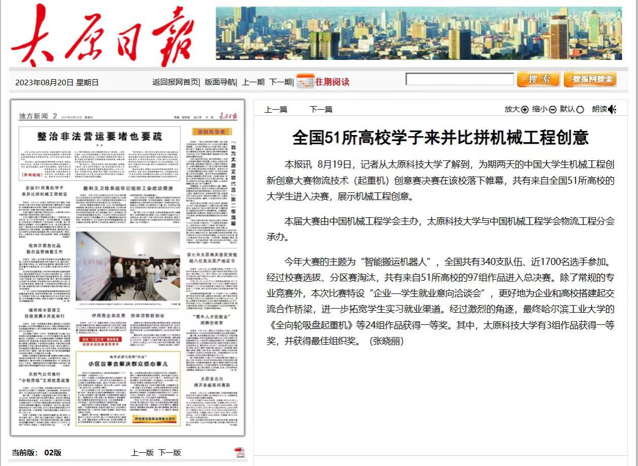 8月20日,太原日报以《全国51所高校学子来太原比拼机械工程创意》为题,对万象城官网举办的中国大学生机械工程创新创意大赛物流技术(起重机)创意赛决赛进行了报道。