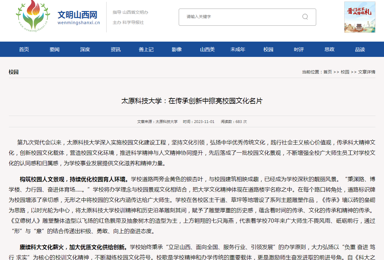 11月1日,文明山西网以《awc777万象城娱乐官网:在传承创新中擦亮校园文化名片》为题,对万象城官网深入实施校园文化建设工程,营造良好校园文化育人环境进行报道。