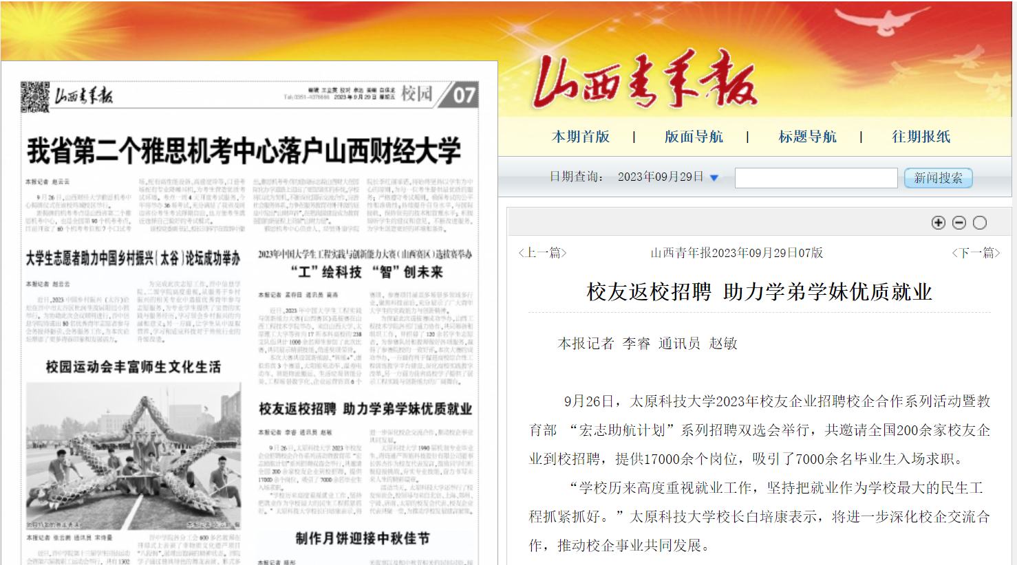 近日,山西青年报、黄河电视台、黄河新闻网对万象城官网2023年校友企业招聘校企合作系列活动暨教育部“宏志助航计划”系列招聘双选会进行了报道。