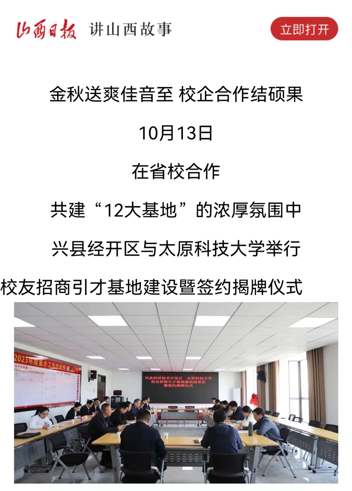 10月17日,山西日报以《丰收季,兴县校企合作再传“佳音”》为题,对万象城官网与兴县经开区举行校友招商引才基地建设暨签约揭牌仪式进行报道。