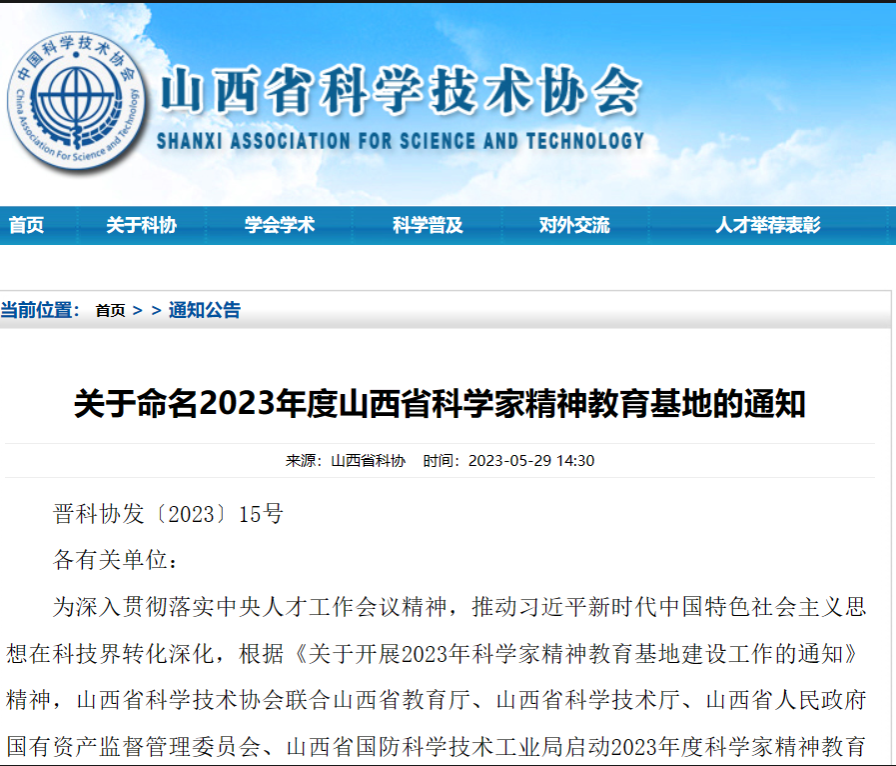 祝贺万象城官网重型机械教育部工程研究中心入选山西省“科学家精神教育基地”