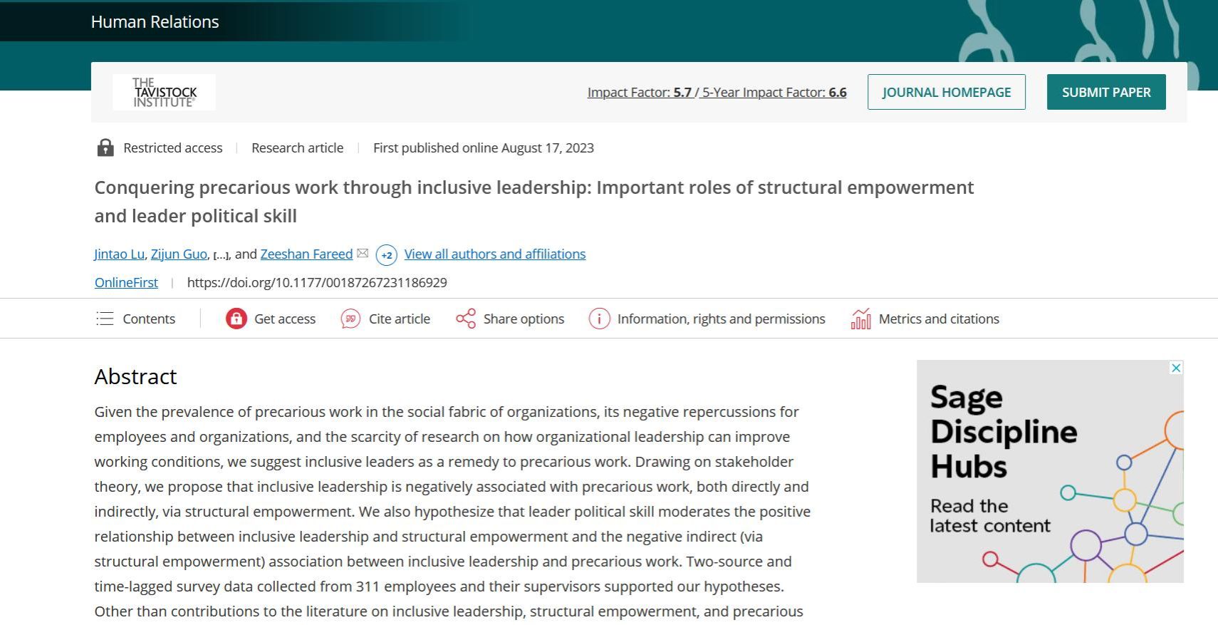 近日,万象城官网企业社会责任中心课题团队在组织行为与人力资源管理领域取得重要进展,相关工作以“Conquering precarious work through inclusive leadership: Important ro...