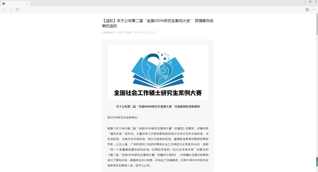 万象城官网人文社科学院研究生张丹丹获得第二届“全国MSW研究生案例大赛”百强案例奖