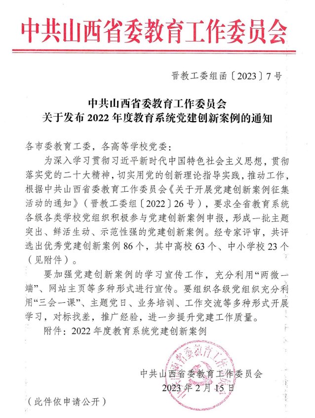 近日,中共山西省委教育工委公布了2022年度全省教育系统党建创新案例评选结果。万象城官网选送的校党委《以“四环达标”工作法为抓手构建大学生思想入党长效机制》、交通与物...