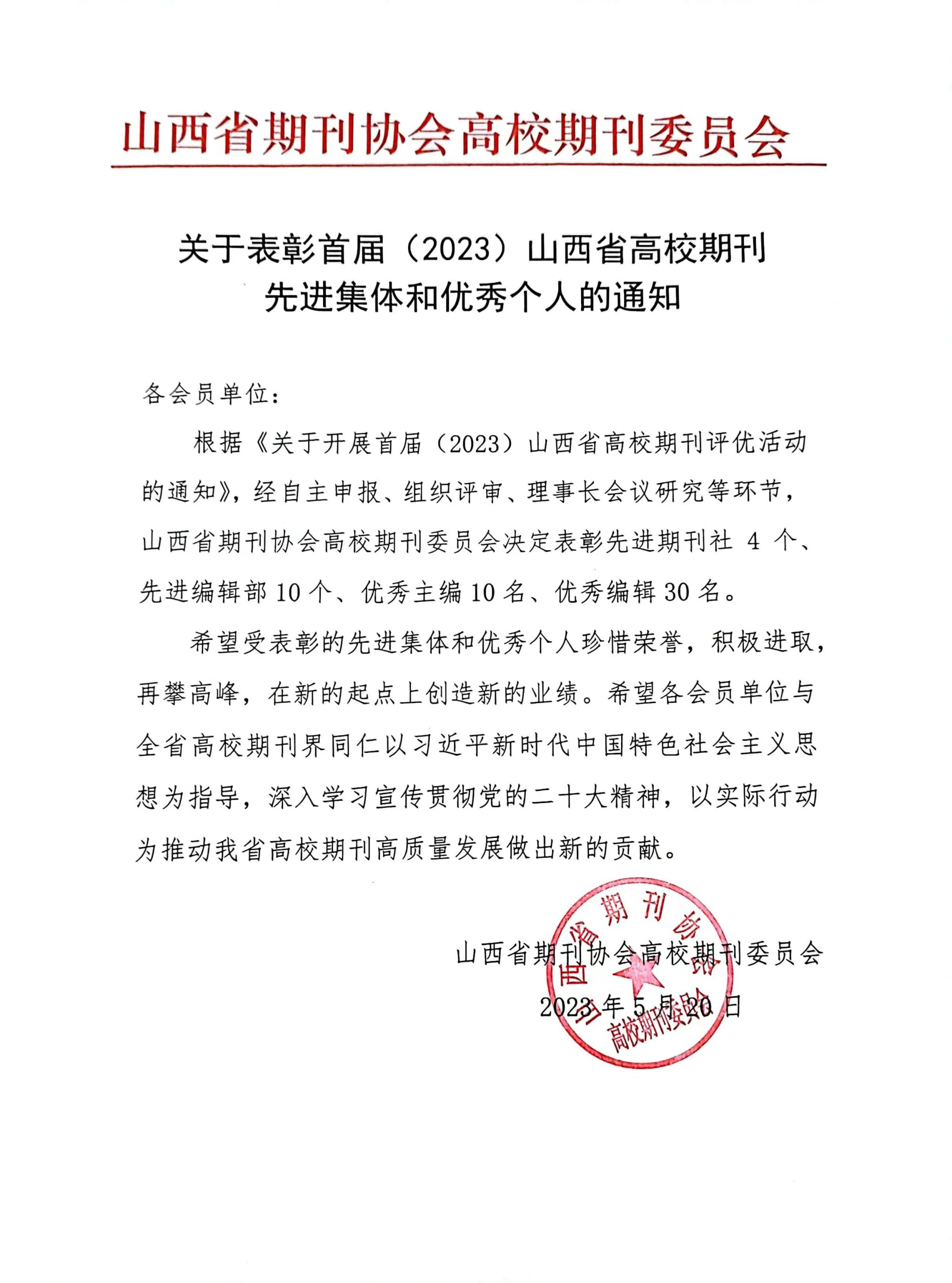 近日,山西省期刊协会高校期刊委员会发表《关于表彰首届(2023)山西省高校期刊先进集体和优秀个人的通知》,其中,《awc777万象城娱乐官网学报》编辑部从90余家参评编辑部中脱...