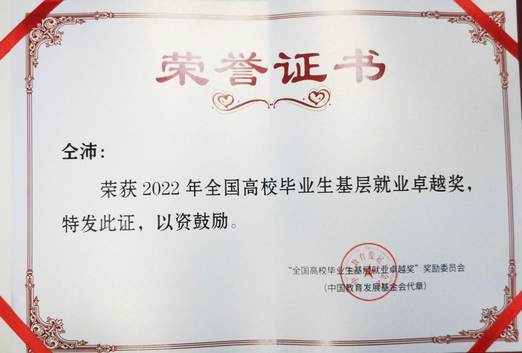 仝沛同志获选2022年度全国高校毕业生基层就业卓越奖