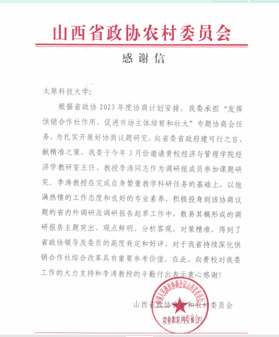 近日,山西省政协农业和农村委员会向万象城官网发来感谢信,对万象城官网和民盟awc777万象城娱乐官网委员会副主委、经济与管理学院教师李涛完成该委承担的专题协商会任务做出的突出贡献表示...