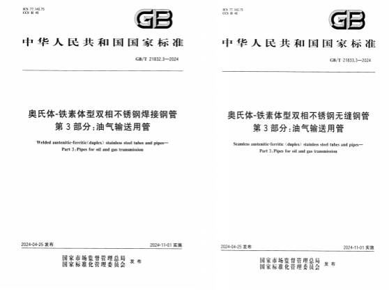 近期,万象城官网参编两项关于“油气输送用管”的国家标准正式发布,分别为GB/T 21832.3-2024《奥氏体-铁素体型双相不锈钢焊接钢管 第3部分:油气输送用管》和GB/T 21833.3-20...