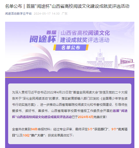 2024年4月首届“阅途杯”山西省高校阅读文化建设成就奖评选活动由山西省高等学校图书情报工作委员会举办,旨在进一步推动山西省高等院校阅读文化建设,共同营造师生爱读...