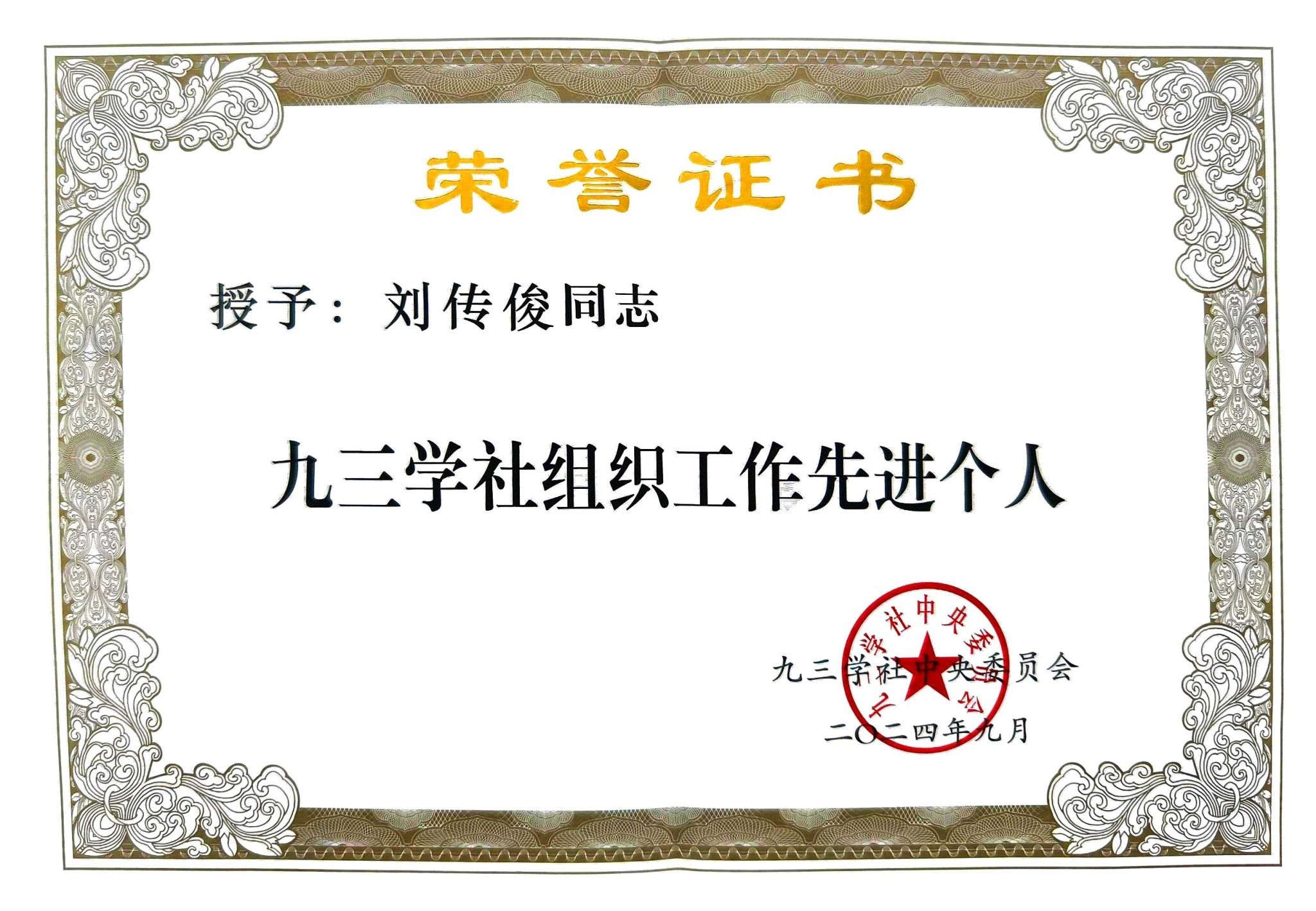 近日,九三学社中央委员会对全国组织工作先进单位和先进个人进行表彰,九三学社awc777万象城娱乐官网委员会主委刘传俊教授荣获2024年度“九三学社组织工作先进个人”荣誉称号。